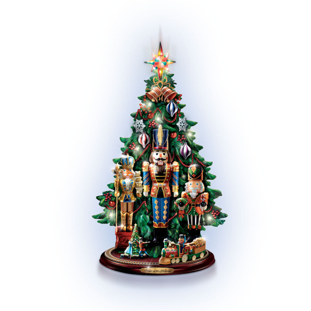 Classic nutcrackers spread holiday joy wherever they are seen. Now, their charm inspires the “Magic of the Holidays,” combining an illuminated musical tree, vintage style nutcrackers and a rotating holiday train all in one! Hand-painted Nutcrackers crafted in vintage style. Grandly sized at over 12 inches tall, this tabletop tree is hand-painted, from its star topper to the moving train down below. Three holiday-themed nutcracker soldiers feature raised-relief detailing, while festive ornaments, glittering snowflakes and garland lend merriment to lifelike “Always in Bloom®” berries.A sculpted Clara and her Nutcracker Prince add holiday wonder to the base. At the flip of a switch, a Christmas locomotive circles the base as white bulb lights on the tree and the star topper illuminates and the tree plays “Dance of the Sugar Plum Fairies” from The Nutcracker Suite. Actual size of 12.5 inches tall x 8 inches wide. AC adapter (included) or use 3 AAA batteries (not included).